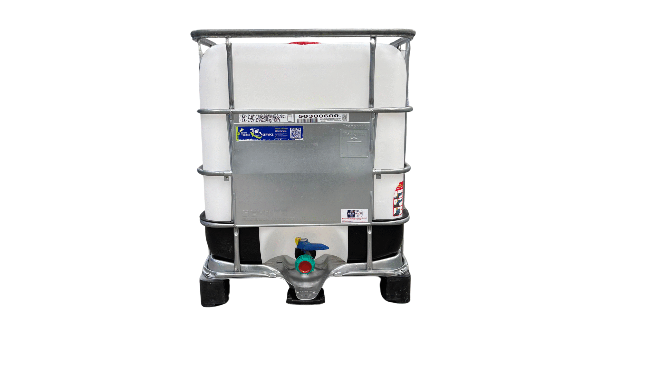 Áru megnevezése:SCHÜTZ mosott 640 literes műanyag raklapos IBC tartály sarokvédővel